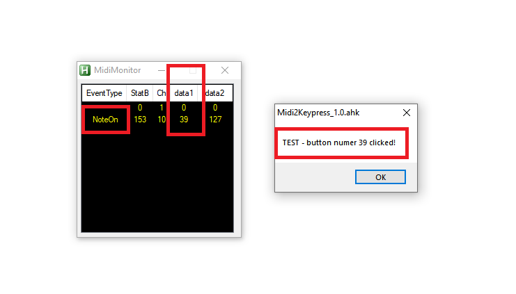 Najpierw zacznijmy od podstawowego testu - demonstracja jak dodać reakcję na pojedyncze kliknięcie. Wklej poniższy text do pliku “userKeysActions.ahk” zastępując domyślną zawartość i zrestartuj aplikację “Midi2Keypress_1.0.ahk”:
