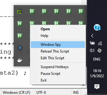 Aby otworzyć “Window Spy” - kliknij prawym klawiszem myszy na ikonkę “AHK” w trayu i wybierz “Window Spy”: