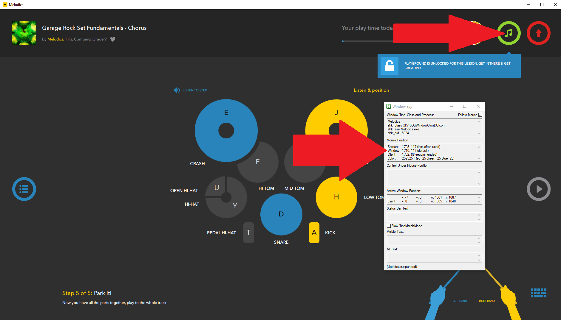Teraz otwórz Melodics i sprawdź pozycję przycisku - w tym przypadku “playground mode”: