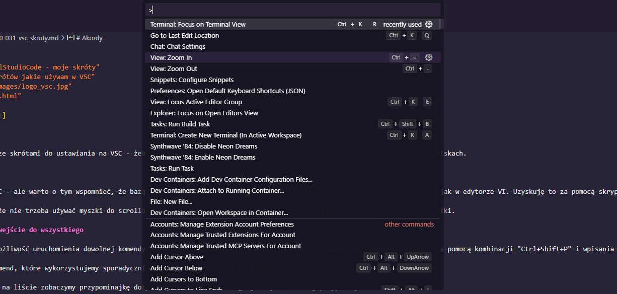W VSC i “zwykłym” VS akordy zaczynają się od kombinacji “Ctrl+K”, po niej możemy przypisać skrót do każdego klawisza.